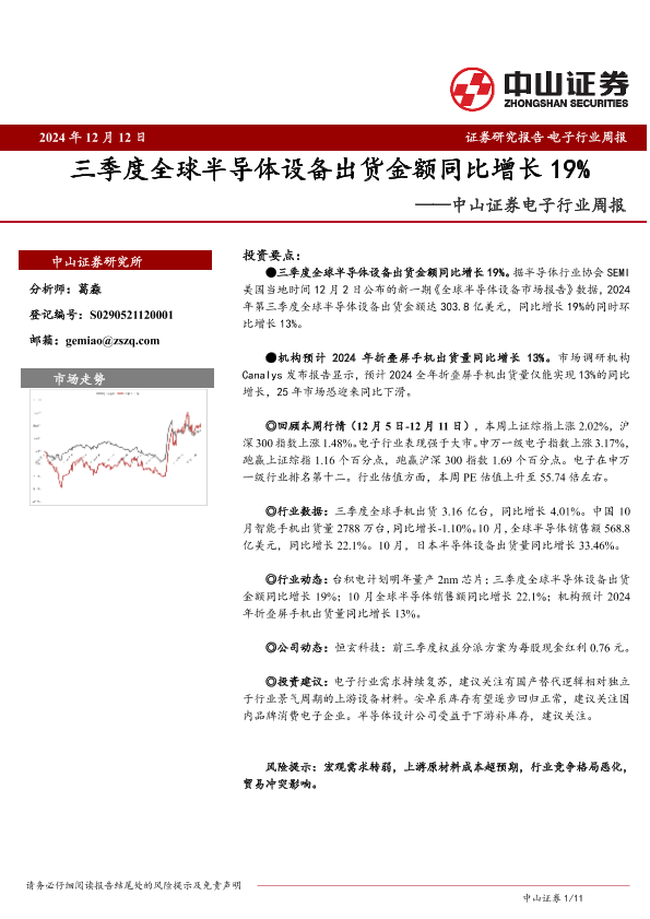 【中山证券】【20241212】20241212-中山证券-电子行业周报:三季度全球半导体设备出货金额同比增长19%-11页