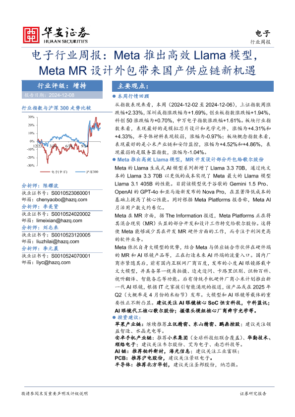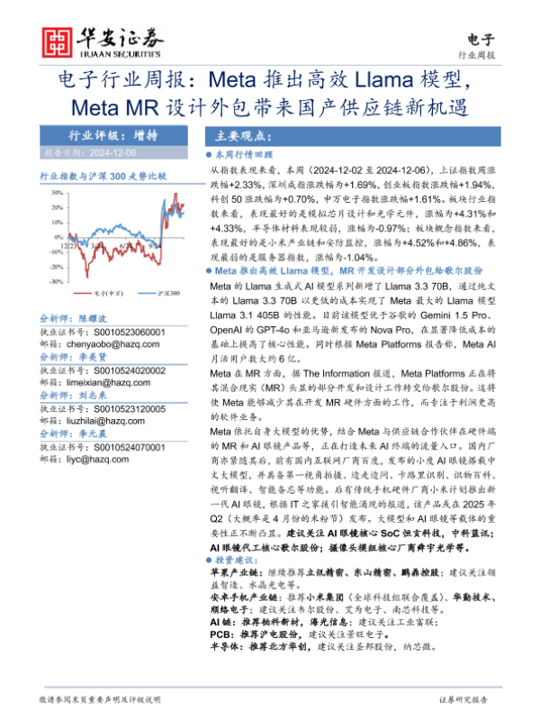 【华安证券】【20241208】20241208-华安证券-电子行业周报:Meta推出高效Llama模型,Meta MR设计外包带来国产供应链新机遇-24页