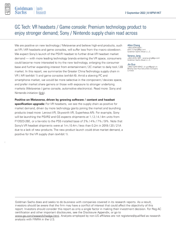 【Goldman Sachs】【20220907】GC Tech VR头戴设备/游戏机:需求强劲的优质科技产品;索尼/任天堂供应链解读-8页