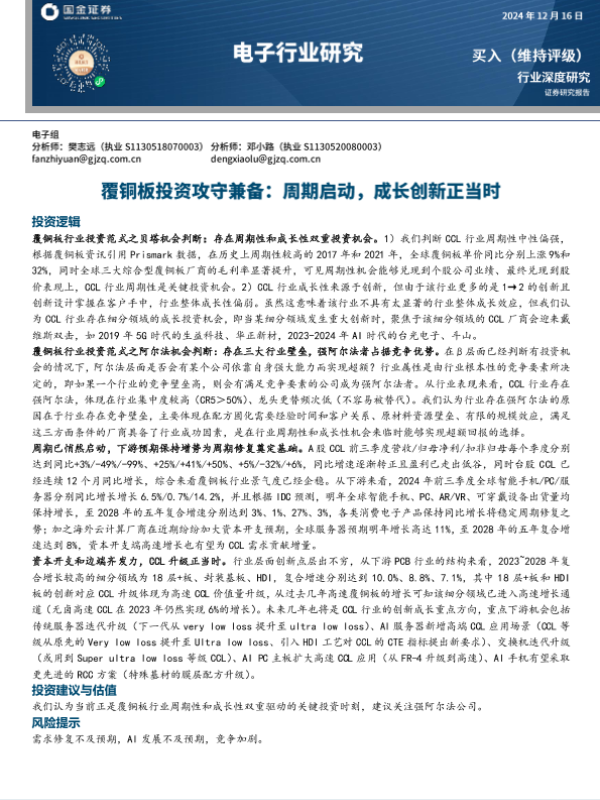 【国金证券】【20241216】电子行业研究:覆铜板投资攻守兼备:周期启动,成长创新正当时-29页