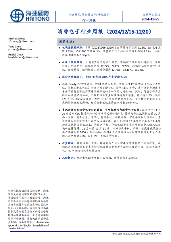 市场预测 投资建议 政策补贴 消费电子 股市分析