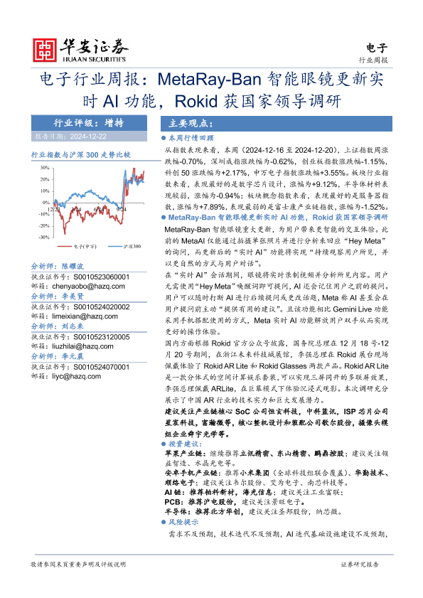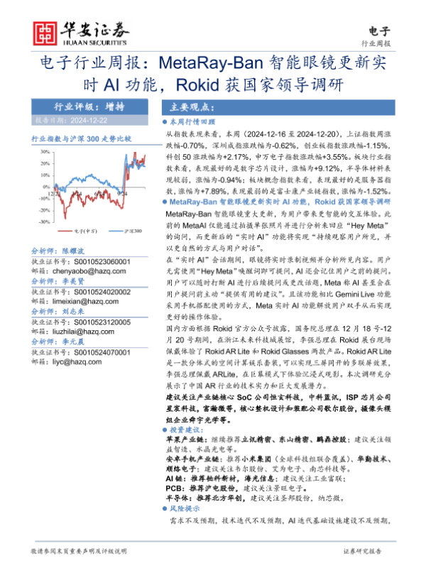 【华安证券】【20241222】20241222-华安证券-电子行业周报:MetaRay-Ban智能眼镜更新实时AI功能,Rokid获国家领导调研-17页