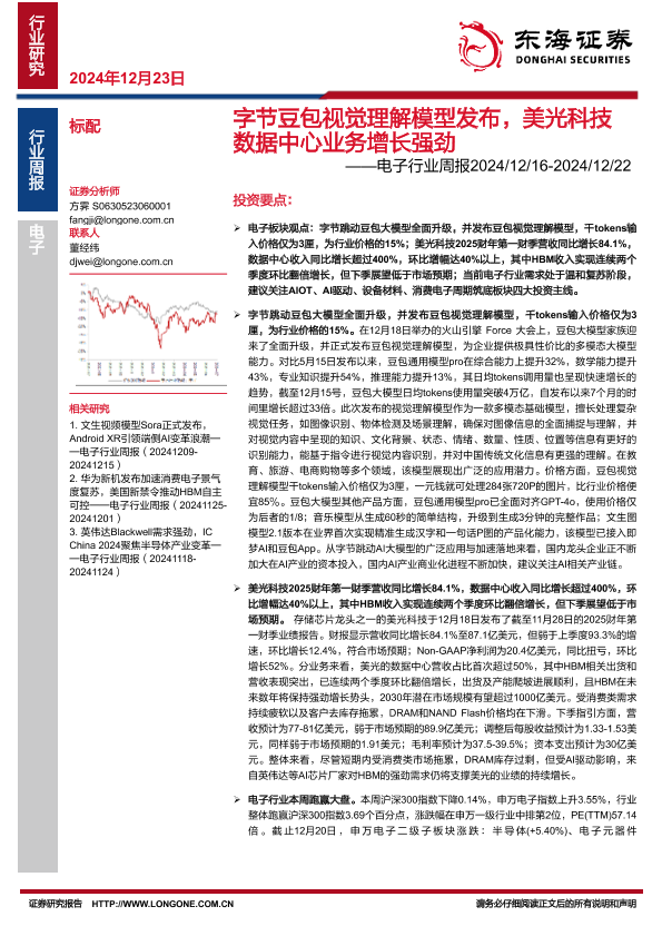 【东海证券】【20241223】20241223-东海证券-电子行业周报:字节豆包视觉理解模型发布,美光科技数据中心业务增长强劲-15页