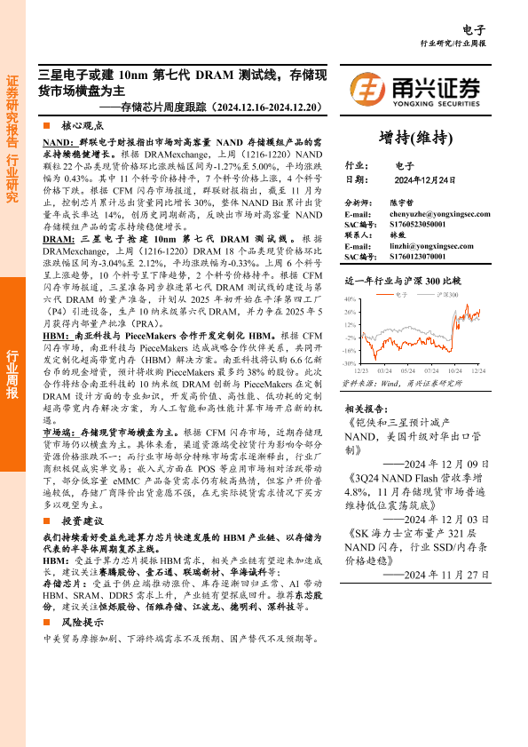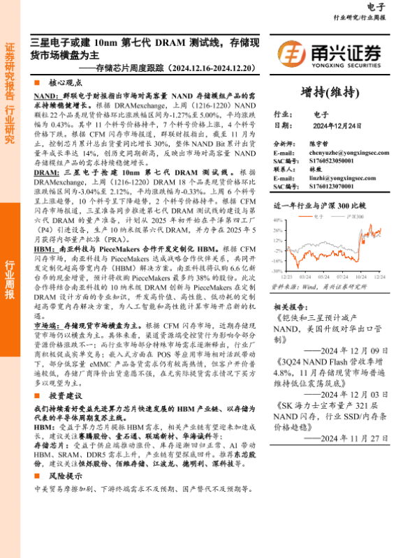【甬兴证券】【20241224】20241224-甬兴证券-电子行业存储芯片周度跟踪:三星电子或建10nm第七代DRAM测试线,存储现货市场横盘为主-10页