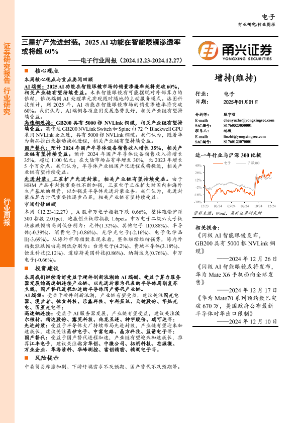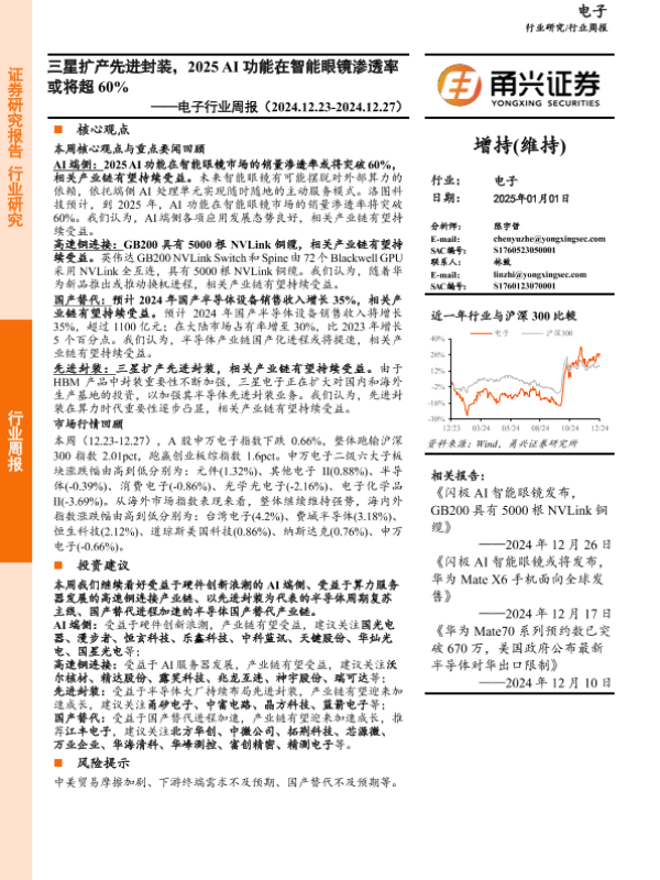 【甬兴证券】【20250101】电子行业周报:三星扩产先进封装,2025 AI功能在智能眼镜渗透率或将超60%-14页