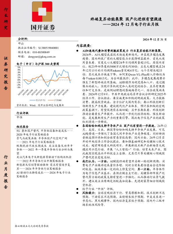 【国开证券】【20241231】2024年12月电子行业月报:终端复苏动能集聚 国产化进程有望提速-10页