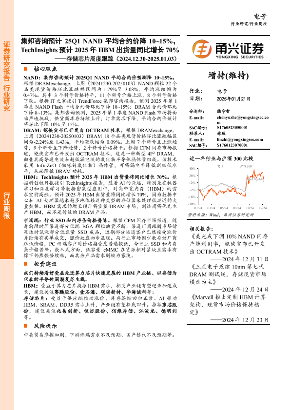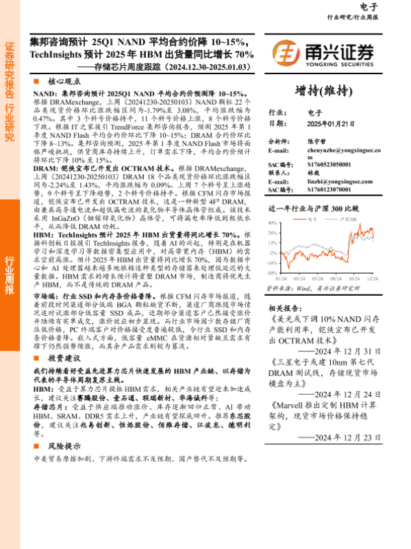【甬兴证券】【20250121】1-甬兴证券-存储芯片周度跟踪:集邦咨询预计25Q1 NAND平均合约价降10~15%,TechInsights预计2025年HBM出货量同比增长70%-10页