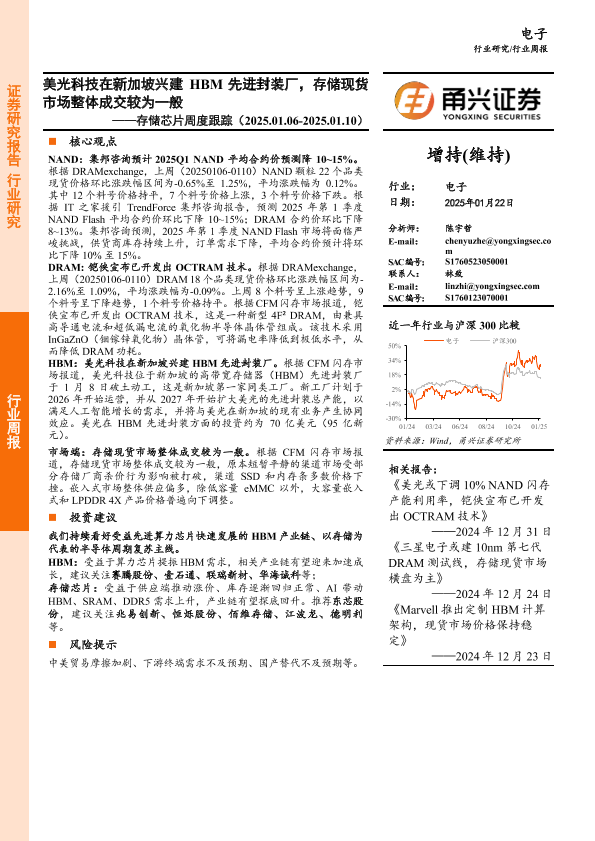【甬兴证券】【20250122】存储芯片行业周度跟踪:美光科技在新加坡兴建HBM先进封装厂,存储现货市场整体成交较为一般-10页