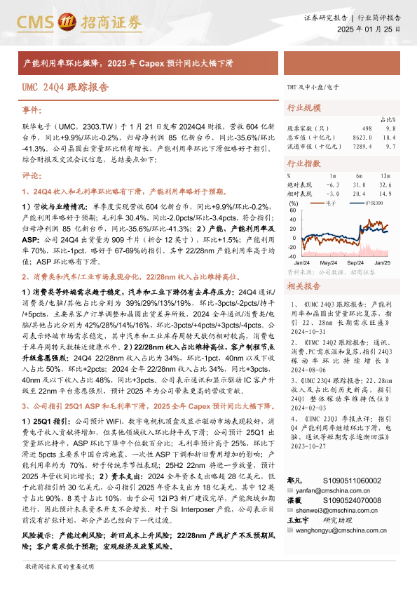 【海通证券】【20250125】UMC 24Q4跟踪报告-产能利用率环比微降,2025年Capex预计同比大幅下滑-12页