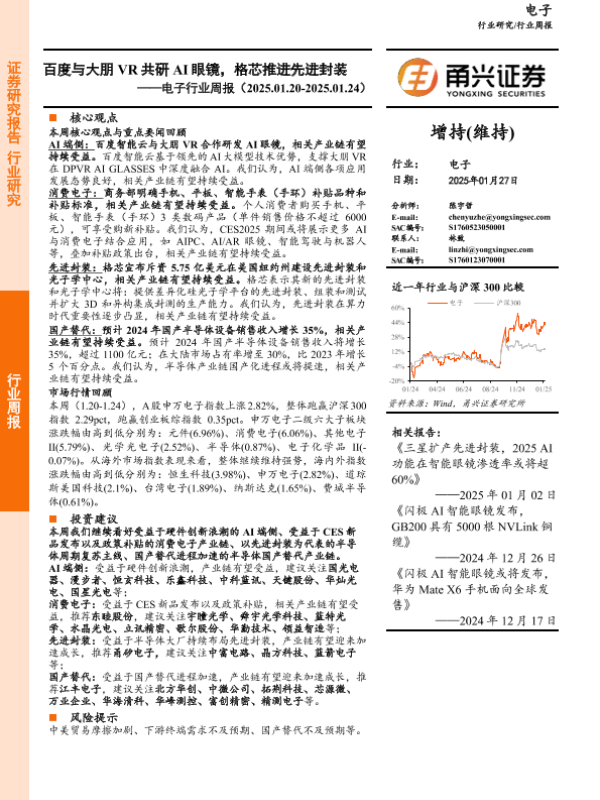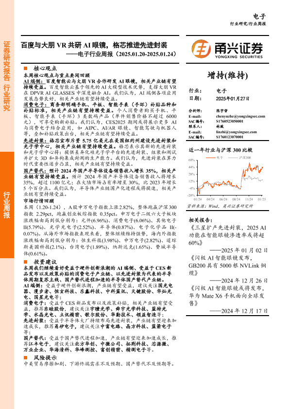 【甬兴证券】【20250127】电子行业周报:百度与大朋VR共研AI眼镜,格芯推进先进封装-14页