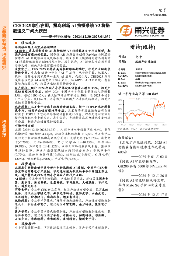 【甬兴证券】【20250126】20250126-甬兴证券-电子行业周报:CES 2025举行在即,雷鸟创新AI拍摄眼镜V3将搭载通义千问大模型-14页