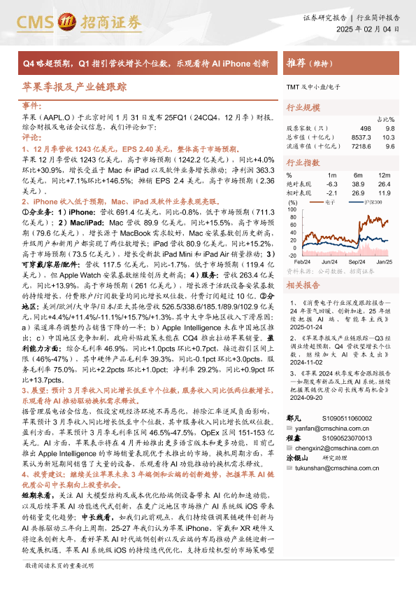 【海通证券】【20250204】苹果季报及产业链跟踪-Q4略超预期,Q1指引营收增长个位数,乐观看待AI iPhone创新-12页