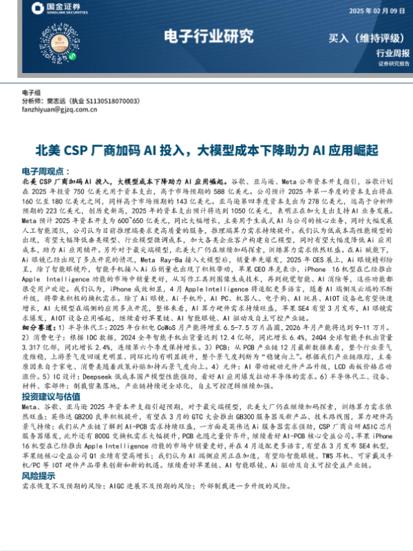 【国金证券】【20250209】北美CSP厂商加码AI投入,大模型成本下降助力AI应用崛起-10页