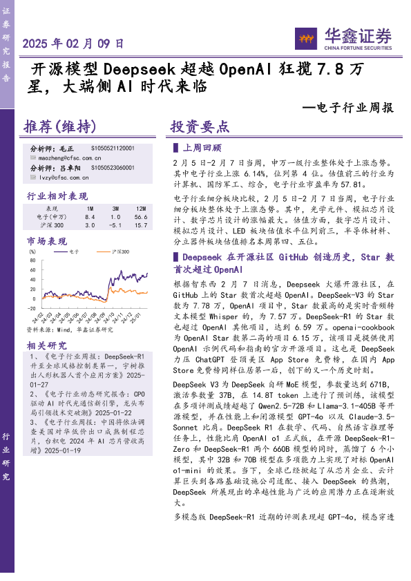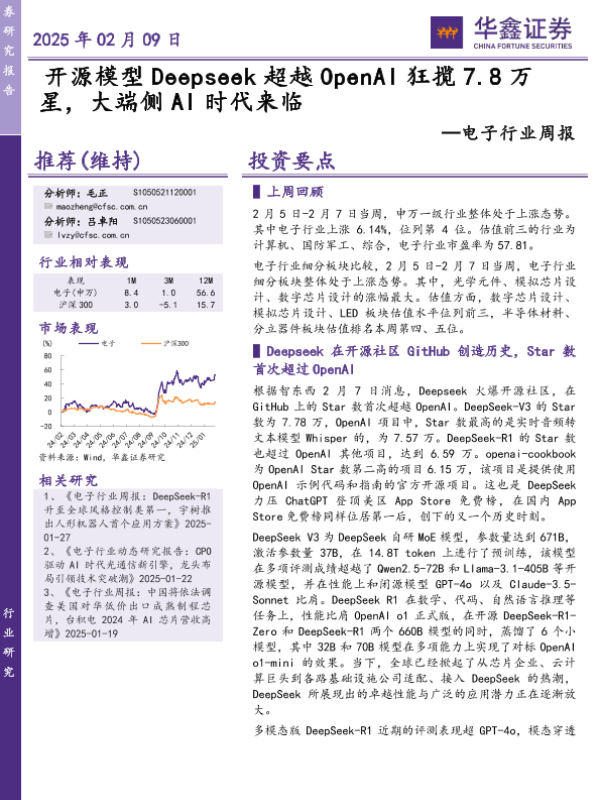 【华鑫证券】【20250209】电子行业周报:开源模型Deepseek超越OpenAI狂揽7.8万星,大端侧AI时代来临-39页