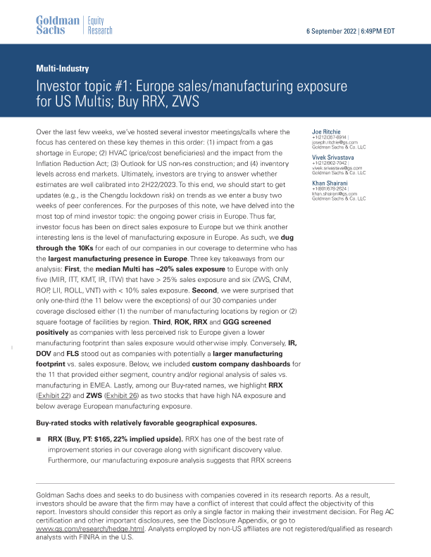 【Goldman Sachs】【20220906】opic #1_ Europe sales_manufacturing exposure for US Multis; Buy RRX, ZWS-18页