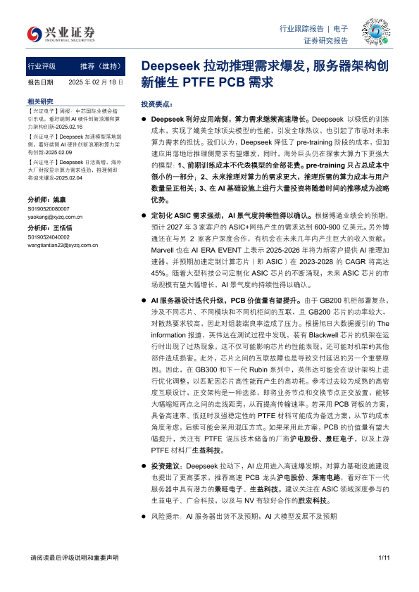 【兴业证券】【20250218】20250218-兴业证券-电子行业跟踪报告:Deepseek拉动推理需求爆发,服务器架构创新催生PTFE PCB需求-11页