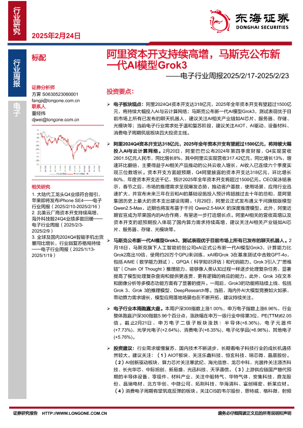 【东海证券】【20250224】20250224-东海证券-电子行业周报:阿里资本开支持续高增,马斯克公布新一代AI模型Grok3-15页