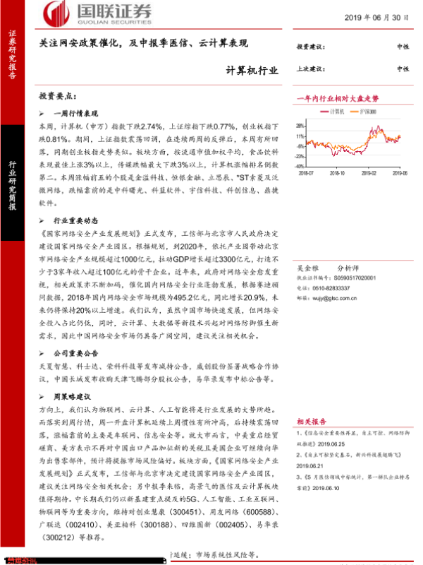 【国联证券】【20190630】计算机行业:关注网安政策催化,及中报季医信、云计算表现-14页