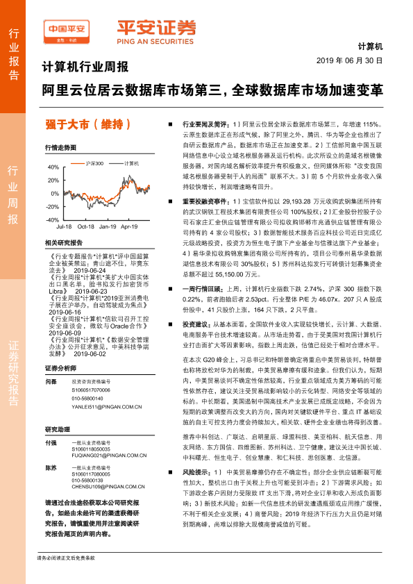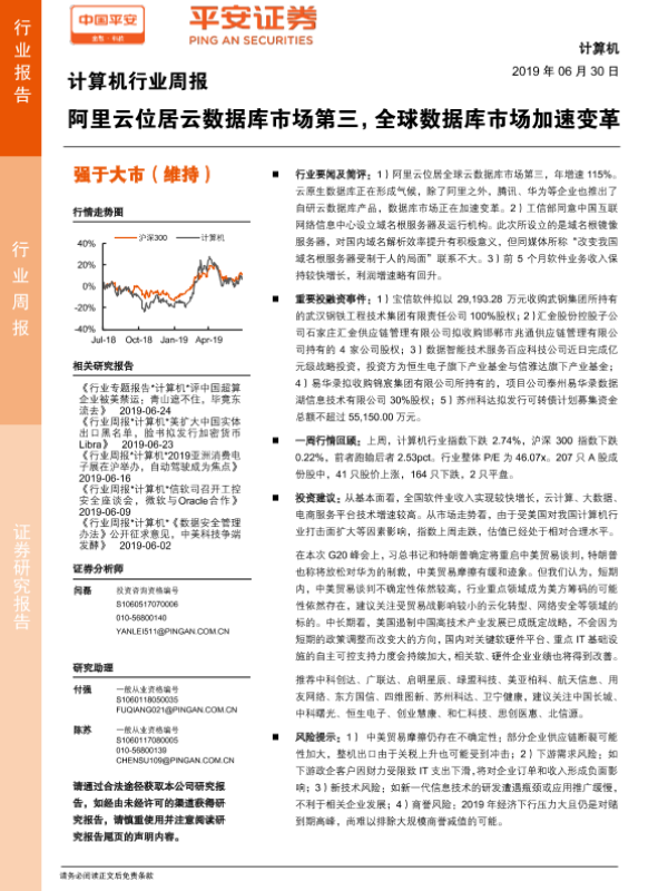【平安证券】【20190630】计算机行业周报:阿里云位居云数据库市场第三,全球数据库市场加速变革-5页