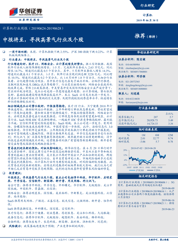 【华创证券】【20190630】20190630-华创证券-计算机行业周报:中报将至,寻找高景气行业及个股-22页