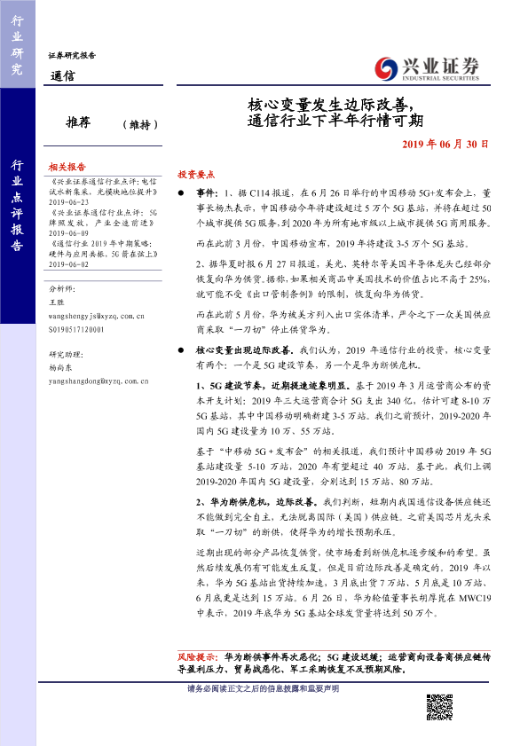 【兴业证券】【20190630】通信:核心变量发生边际改善,通信行业下半年行情可期-3页
