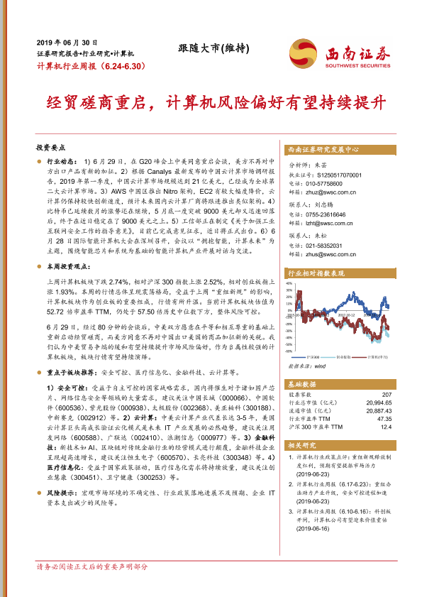 【西南证券】【20190630】计算机行业周报:经贸磋商重启,计算机风险偏好有望持续提升-14页