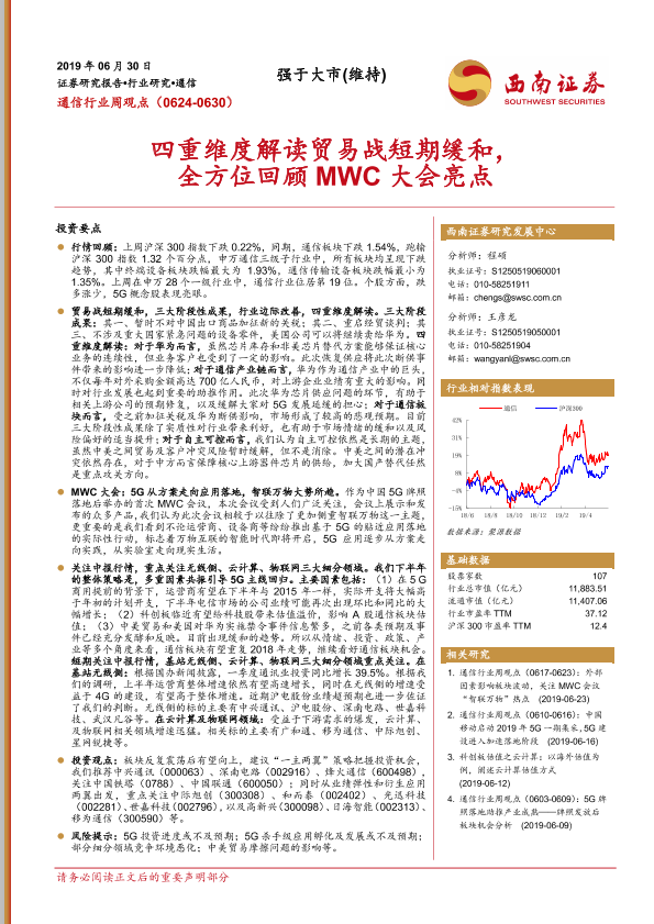 【西南证券】【20190630】20190630-西南证券-通信行业周观点:四重维度解读贸易战短期缓和,全方位回顾MWC大会亮点-40页