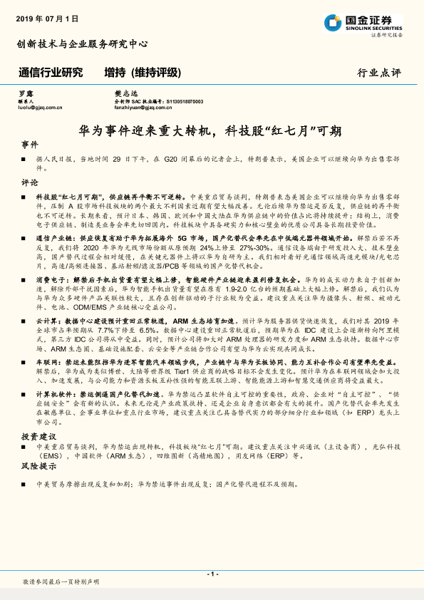 【国金证券】【20190701】通信行业研究:华为事件迎来重大转机,科技股“红七月”可期-10页