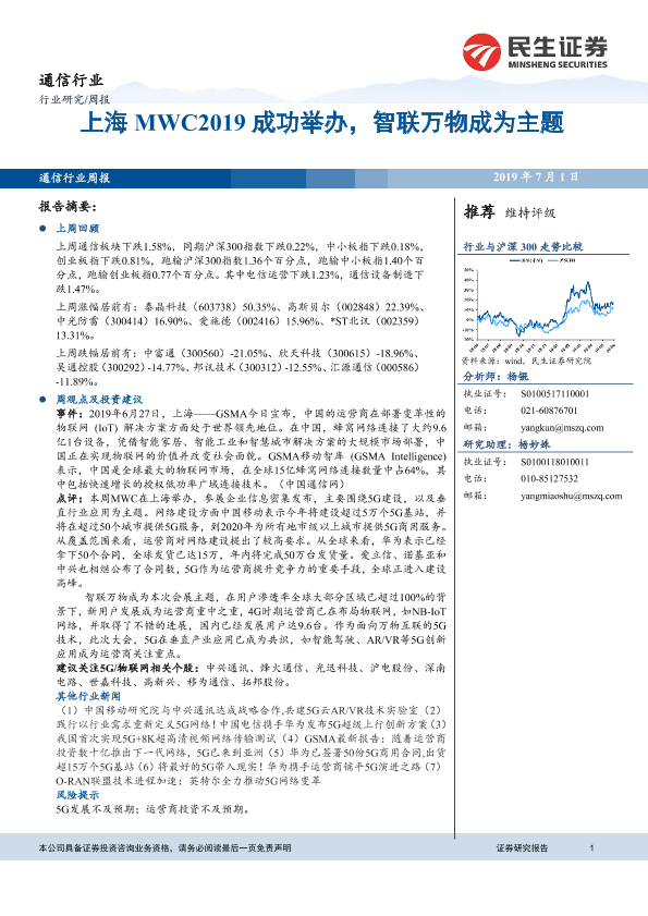 【民生证券】【20190701】通信行业周报:上海MWC2019成功举办,智联万物成为主题-11页