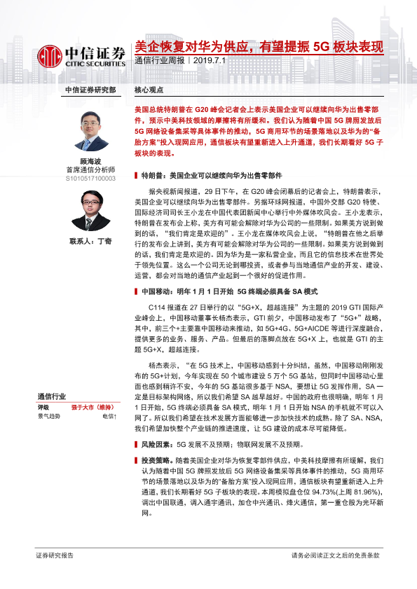 【中信证券】【20190701】美企恢复对华为供应,有望提振5G板块表现-7页