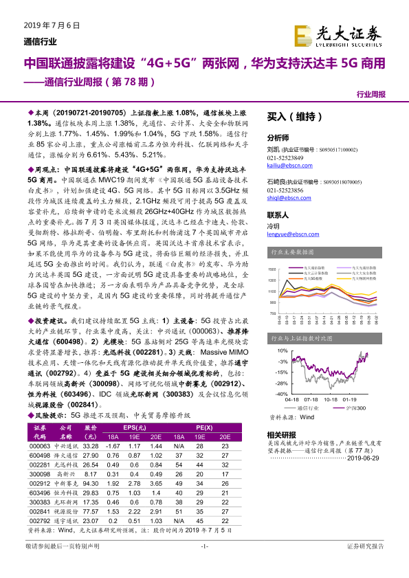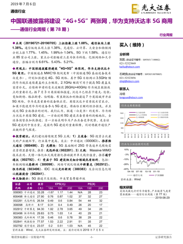 【光大证券】【20190706】20190706-光大证券-通信行业周报(第78期):中国联通披露将建设“4G+5G”两张网,华为支持沃达丰5G商用-13页