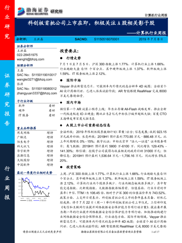 【渤海证券】【20190708】计算机行业周报:科创板首批公司上市在即,积极关注A股相关影子股-17页