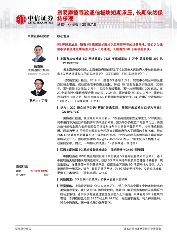 5G建设 上海政策 基站部署 贸易摩擦 通信行业