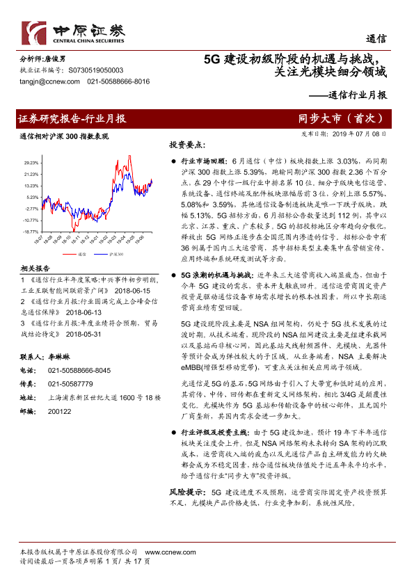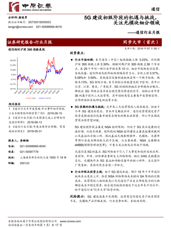 【中原证券】【20190708】5G建设初级阶段的机遇与挑战,关注光模块细分领域-17页