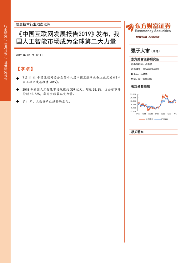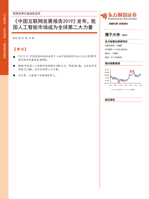 【东方财富证券】【20190712】20190712-东方财富证券-信息技术行业动态点评:《中国互联网发展报告2019》发布,我国人工智能市场成为全球第二大力量-3页