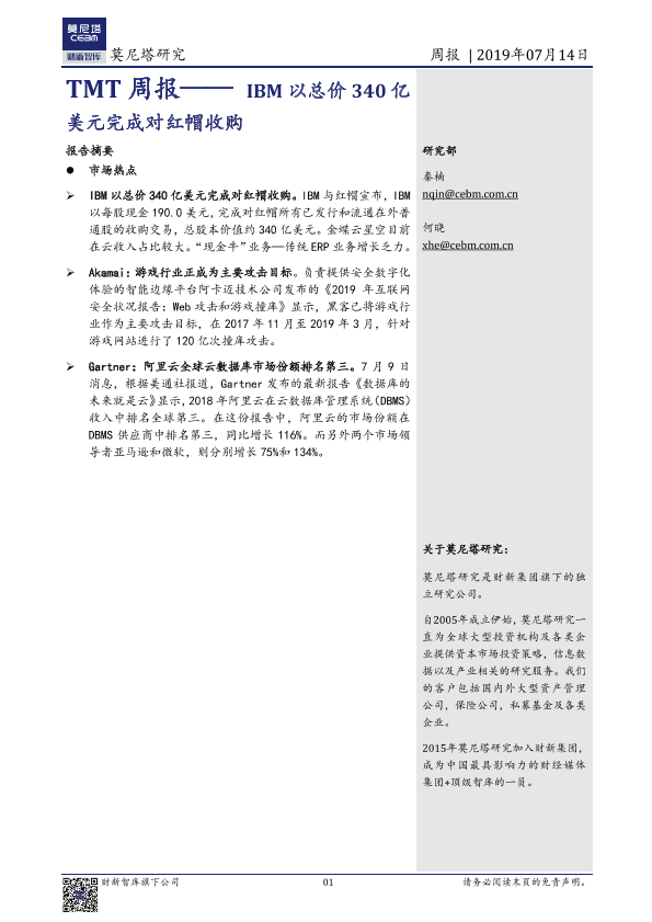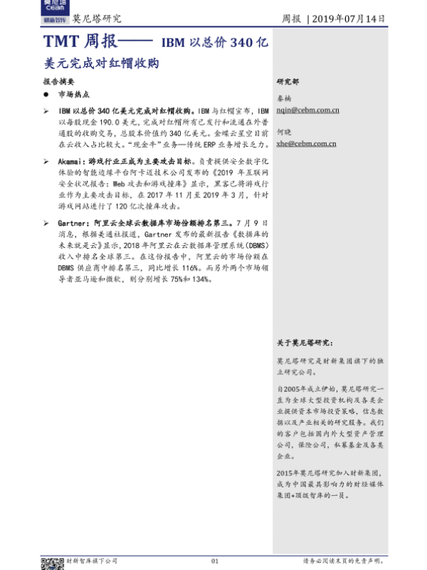 【莫尼塔研究】【20190714】TMT周报——IBM以总价340亿美元完成对红帽收购-9页