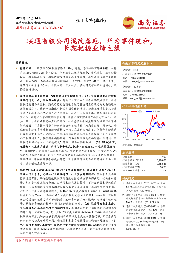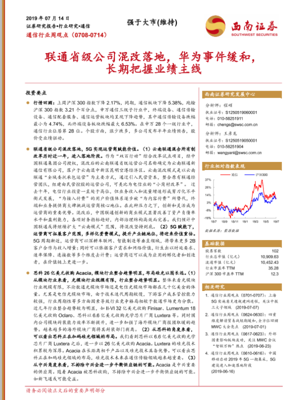 【西南证券】【20190714】20190714-西南证券-通信行业周观点:联通省级公司混改落地,华为事件缓和,长期把握业绩主线-23页