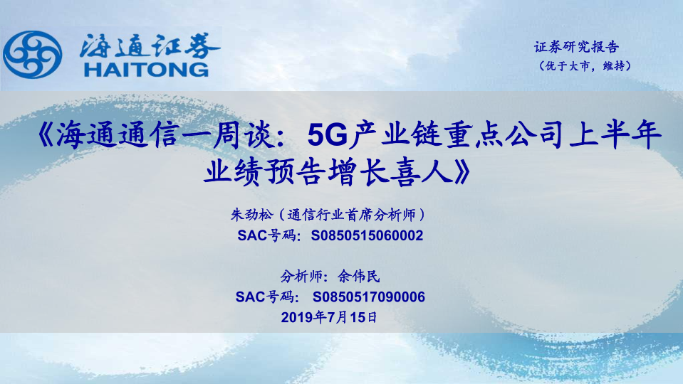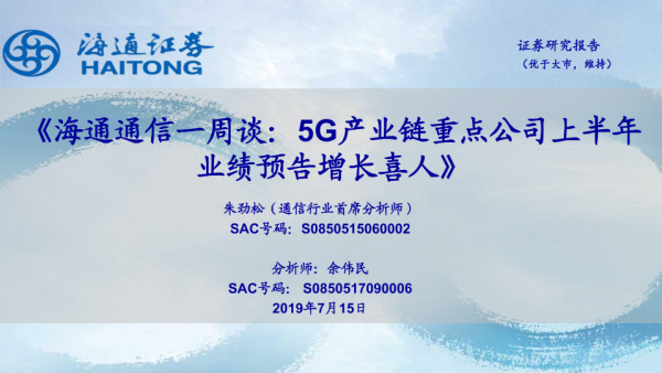 【海通证券】【20190715】海通通信一周谈:5G产业链重点公司上半年业绩预告增长喜人-9页