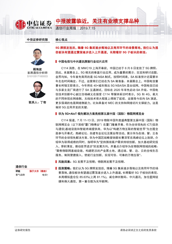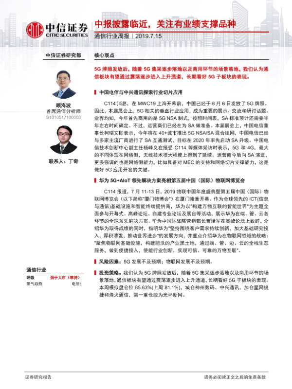【中信证券】【20190715】20190715-中信证券-通信行业周报:中报披露临近,关注有业绩支撑品种-8页