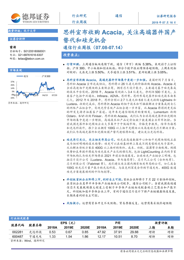 【德邦证券】【20190716】20190716-德邦证券-通信行业周报:思科宣布收购Acacia,关注高端器件国产替代和硅光机会-4页