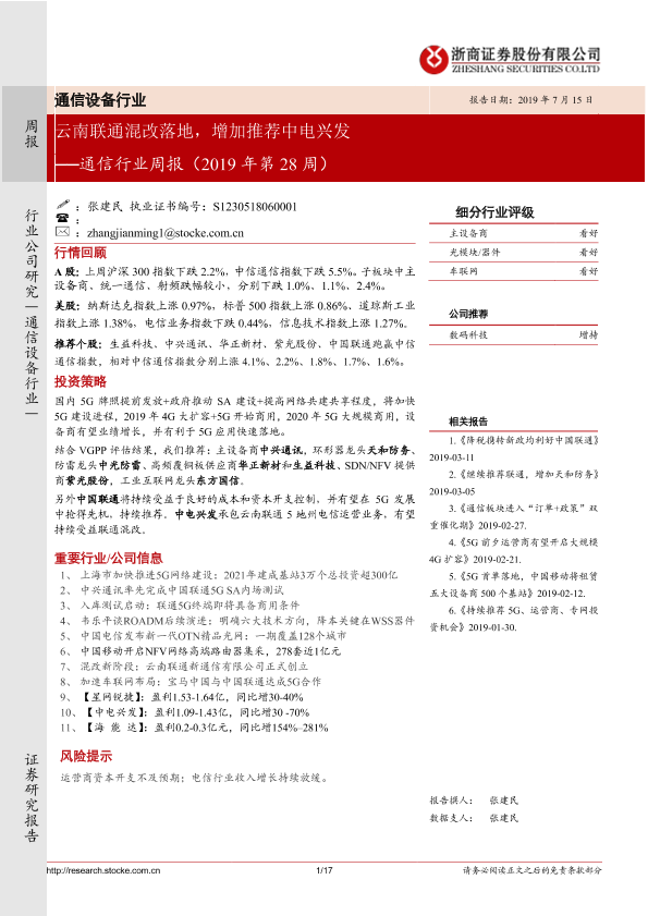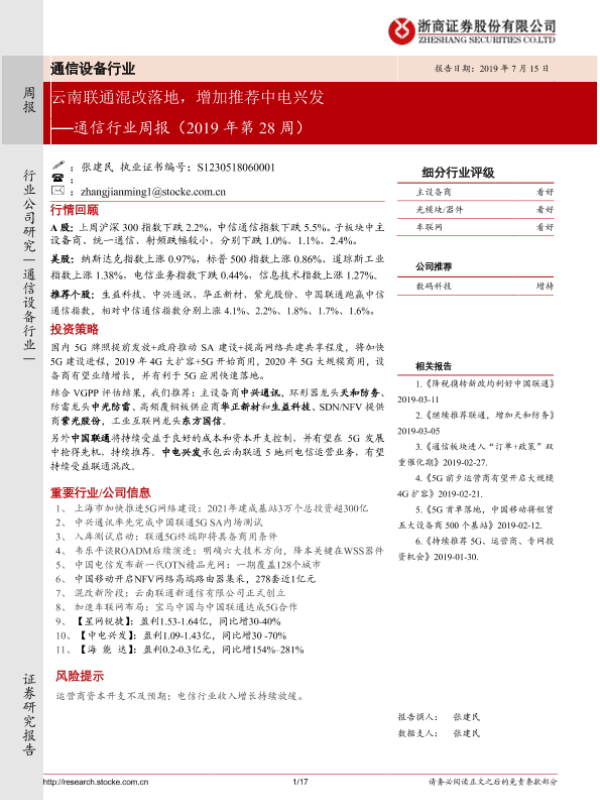 【浙商证券】【20190715】通信行业周报(2019年第28周):云南联通混改落地,增加推荐中电兴发-17页
