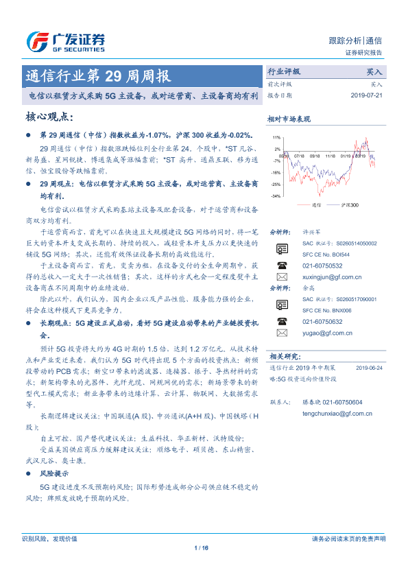 【广发证券】【20190721】通信行业第29周周报:电信以租赁方式采购5G主设备,或对运营商、主设备商均有利-16页