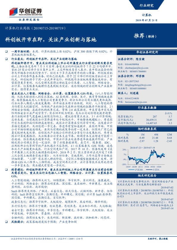 【华创证券】【20190721】20190721-华创证券-计算机行业周报:科创板开市在即,关注产业创新与落地-20页