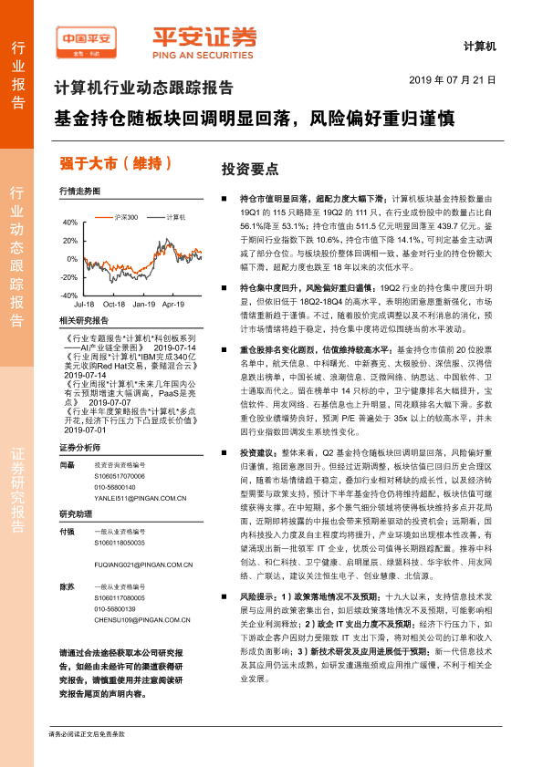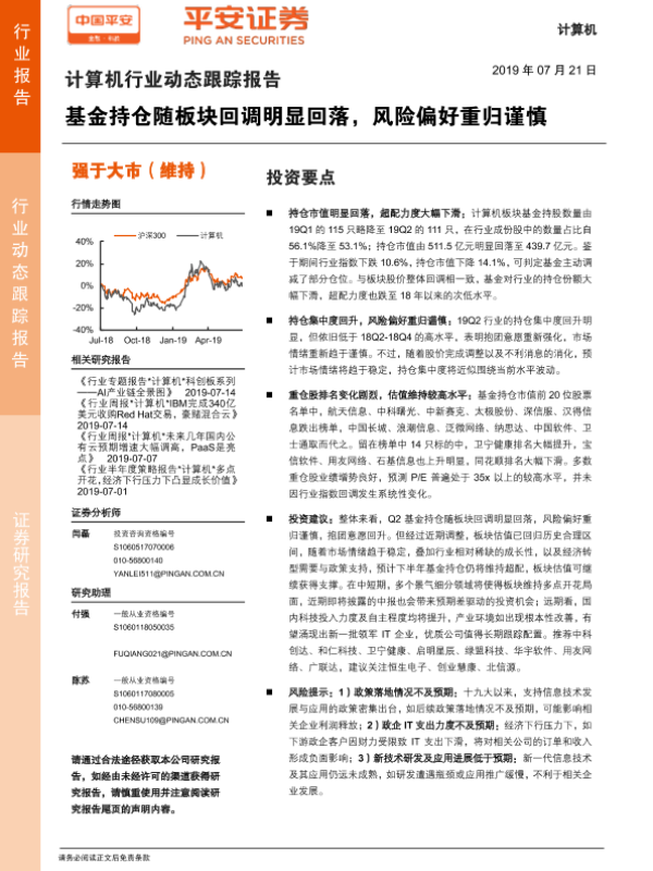 【平安证券】【20190721】计算机行业动态跟踪报告:基金持仓随板块回调明显回落,风险偏好重归谨慎-8页