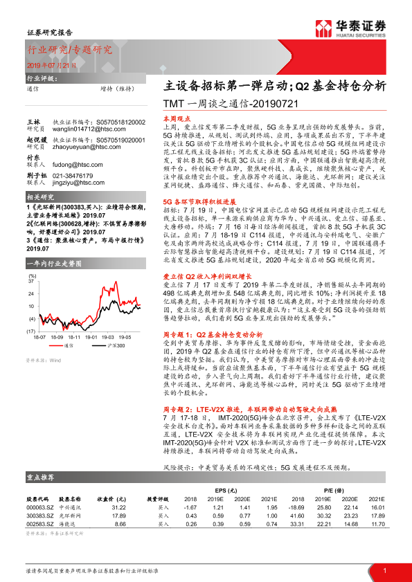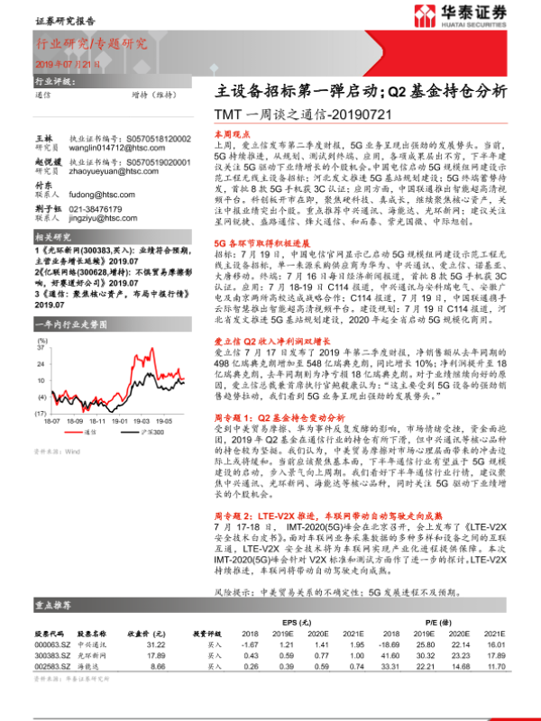 【华泰证券】【20190721】TMT一周谈之通信:主设备招标第一弹启动;Q2基金持仓分析-16页