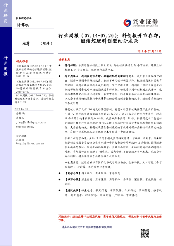 【兴业证券】【20190721】行业周报(07.14-07.20):科创板开市在即,继续超配科创型细分龙头-17页