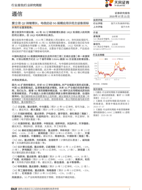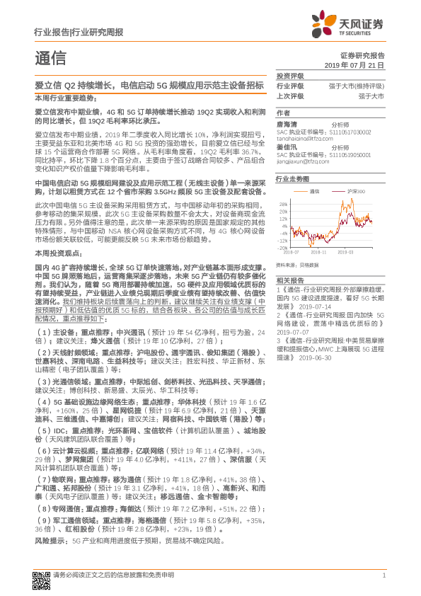 【天风证券】【20190721】通信行业研究周报:爱立信Q2持续增长,电信启动5G规模应用示范主设备招标-16页