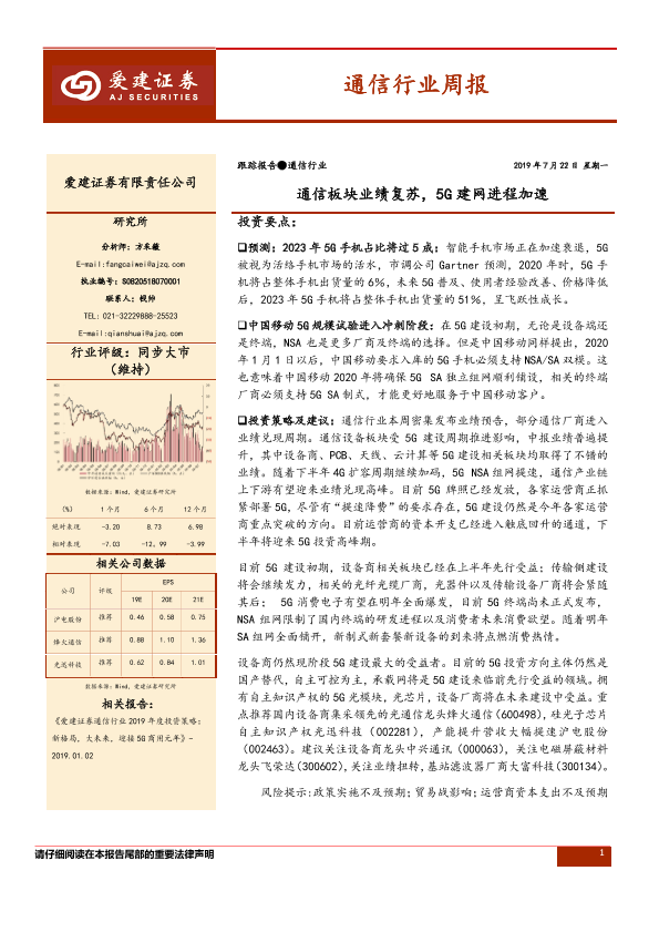 【爱建证券】【20190722】通信行业周报:通信板块业绩复苏,5G建网进程加速-13页