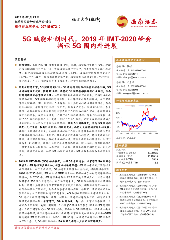 【西南证券】【20190721】20190721-西南证券-通信行业周观点:5G赋能科创时代,2019年IMT-2020峰会揭示5G国内外进展-25页