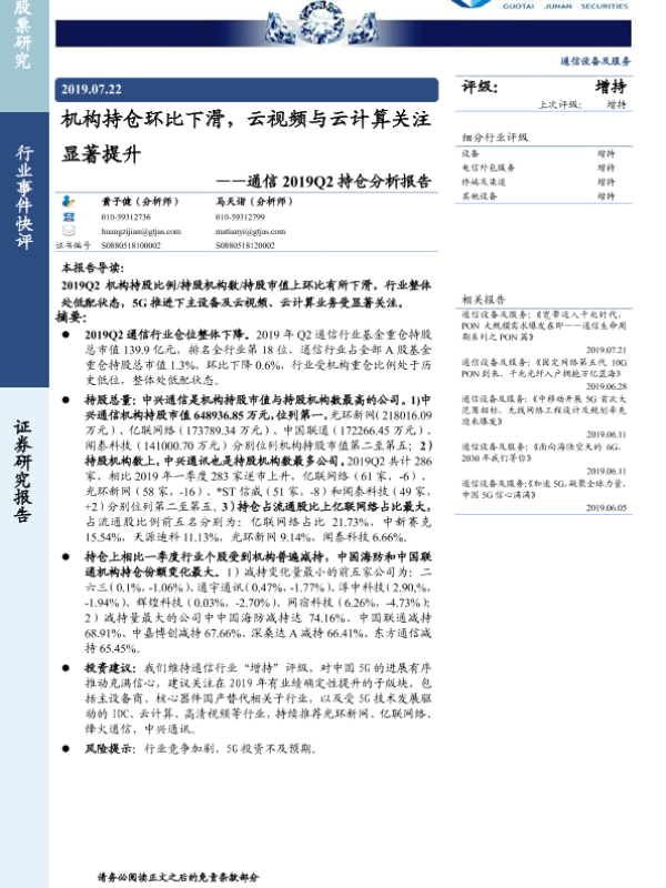 【国泰君安证券】【20190722】机构持仓环比下滑,云视频与云计算关注显著提升——通信2019Q2持仓分析报告-7页